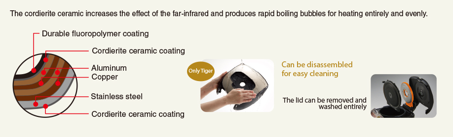 In total five-layer metal pot, including high thermal conductivity copper (2 layer) of fluorine and clay pot (2 layer) total 3 layer coating. Enhanced thermal diffusion of, I 'Also, clay coating of high heat storage Tsuyoshi fire IH power intact rice tells.